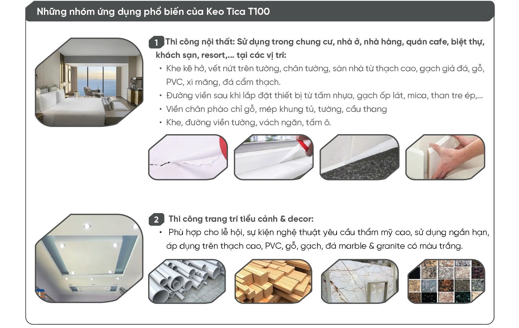 Keo trám tường Tica T100 được ưa dùng bởi cả đội ngũ thi công công trình chuyên nghiệp hay cho các hoạt động DIY, sửa chữa dân dụng trong gia đình.