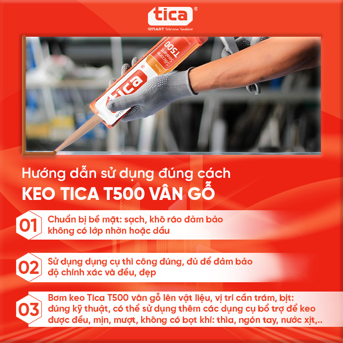 Keo Tica T500 vân gỗ là một sản phẩm dễ sử dụng và ứng dụng rộng rãi trong nhiều lĩnh vực. Để đạt được hiệu quả tối ưu khi sử dụng sản phẩm này, hãy tham khảo các bước hướng dẫn sau: