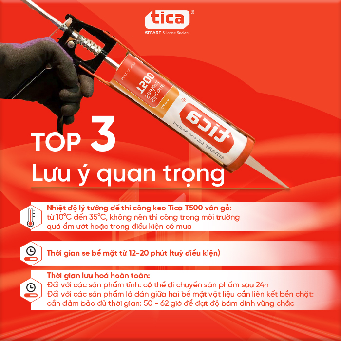 - Nhiệt độ lý tưởng để thi công Keo Tica T500 vân gỗ: từ 10°C đến 35°C. Tránh thi công khi nhiệt độ quá thấp hoặc quá cao, vì điều này có thể ảnh hưởng đến độ bám dính và quá trình lưu hóa của keo.